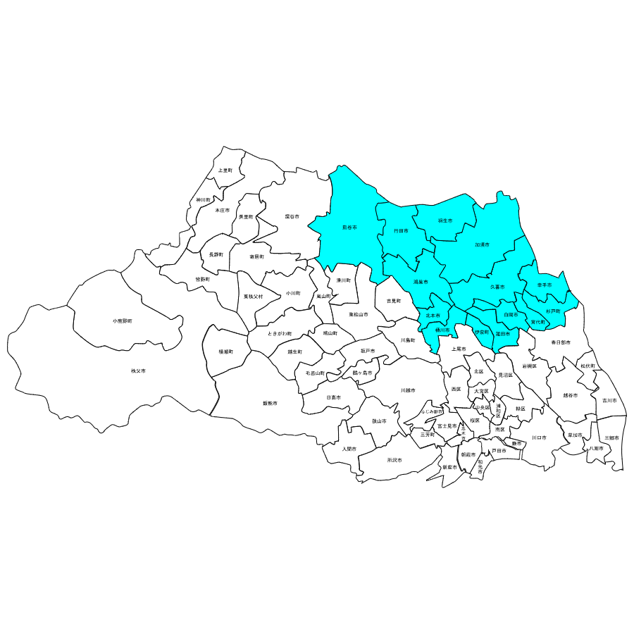 埼玉県:加須市・羽生市・久喜市・幸手市・白岡市・杉戸町・宮代町・蓮田市・行田市・熊谷市・鴻巣市・北本市・桶川市